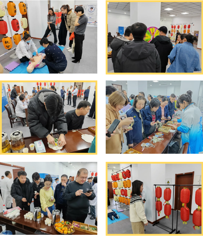 活动现场心肺康复专家现场演示加讲解心肺复苏;耳穴压豆、推拿体验;亲手制作香囊、中药扇,品尝代茶饮了解中药知识;猜灯谜、幸运转盘用娱乐收获健康。