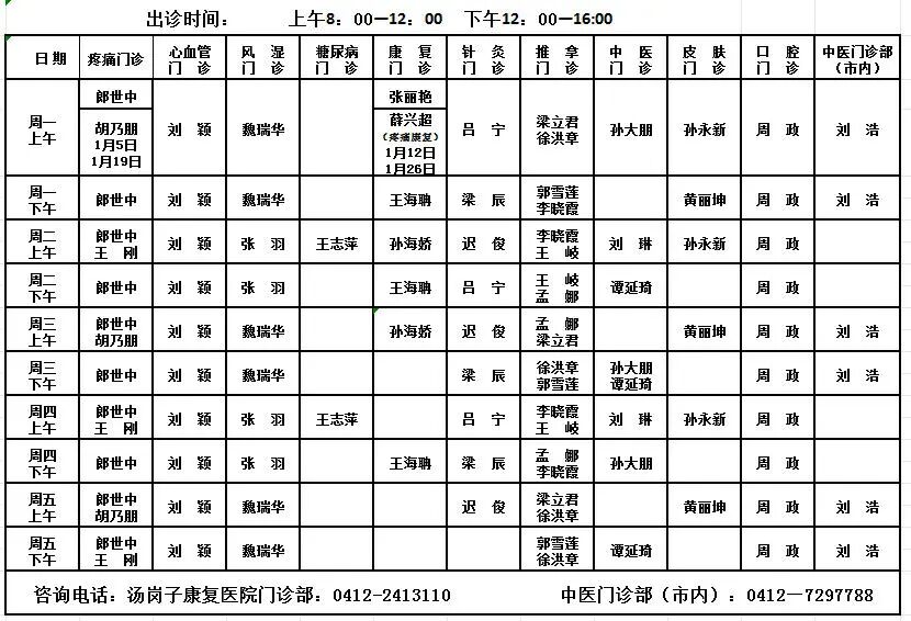 【出诊表】汤岗子康复医院2026年1月专家出诊表